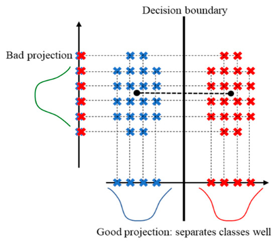 Discriminant analysis (DA) is a data classification method that finds the decision boundary assuming that different classes generate data based on different Gaussian distributions, as shown in Figure 9 [25]. To train the classifier, the fitting function estimates the parameters of the Gaussian distribution for each class, and the trained classifier finds the class with the lowest false classification for predicting a new class of data. When the variable x is projected on a vector (axis) called w and the center (average) vector of each category is m1, m2, the method finds the vector w where m1 and m2 are located far apart. Here, the goal is to maximize the center of both categories and minimize the variance. There are two types of DA, namely, linear discriminant analysis (LDA) and quadratic discriminant analysis (QDA).