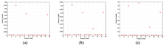 For the feature sets A to E, three NCA analyzes were conducted with different functions to identify the most significant features among the 20 data features extracted in Figure 7. NCA was performed using MATLAB, and three functions were used: lgfgs, Minibatch-lbfgs, and sgd. lbfgs is the limited memory Broyden–Fletcher–Goldfarb–Shanno (LBFGS) algorithm, and sgd is the stochastic gradient descent (SGD) algorithm, and minibatch-lbfgs is the stochastic gradient descent with LBFGS algorithm applied to mini-batches. Figure 10 shows three NCA results for feature set A. The feature index in Figure 10 is the order of the features extracted in step 3 of Figure 7, and a large feature weight means that the bias of the data is large. As a result of the analysis, it is confirmed that the 4th, 9th, 14th, and 19th features exhibit the highest bias. These four features are the geometrical moment of area of R real values, R imaginary values, real values, and imaginary values. In other feature sets, the geometrical moment of area showed the greatest bias equally. Therefore, the analysis was performed using features 4 and 9 in each feature set.