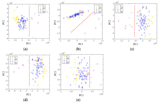 2D plot according to division of frequency range using principal component: (a) feature set A (0–10 kHz); (b) feature set B (0–4 kHz); (c) feature set C (4–10 kHz); (d) feature set D (4–7 kHz); (e) feature set E (7–10 kHz).