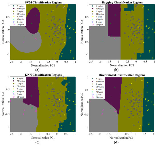 In Figure 12d, the DA method was developed using regularized quadratic discriminant analysis to find the class with the lowest false classification cost, if different classes generate data based on different Gaussian distributions. A more accurate second-order discriminant analysis method was used for multiclass classification.