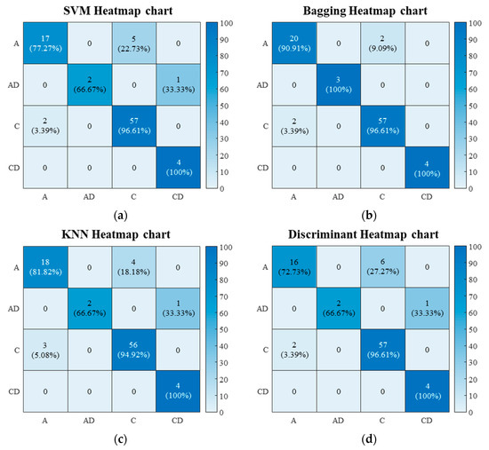 Heatmap chart of prediction results using developed machine learning classifiers: (a) the heat map result of the SVM classifier; (b) the heat map result of the bagging classifier; (c) the heat map result of the kNN classifier; (d) the heat map result of the DA classifier.