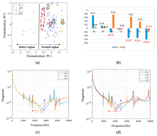 Most of the material classification is performed, but there are some overlapping portions at the interface. This may be an error that occurs because the insulator is fabricated by hand. In addition, there is a material classification in damage, but the FRF waveform due to damage is so variable that it may even be at the interface. Moreover, the data distributed at some interfaces and the data distributed at the center of the normal data are reanalyzed in Figure 14. In Figure 14a, the interface data and unusual values are sampled. The PC1 and PC2 values of the selected A1–3 and C1–4 data are shown in Figure 14b. FRF results for normal and interface data and normal and unusual data are plotted in Figure 14c,d.