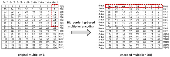 The result of the 128-bit multiplier encoding process. Left-side: original input multiplier, Right-side: encoded multiplier.