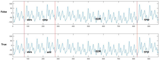 We find out that the number of garbage registers does not affect SPA security on the target 8-bit AVR MCU, and we reduce the number of garbage registers from eight to just one. We have conducted SPA security analysis for proving the security impact of reducing the number of garbage registers. We have utilized the KLA-SCARF evaluation board having an 8-bit ATmega128 MCU and gather power traces with a LeCroy HDO06104A oscilloscope with a sampling rate 500 MS/s. Figure 4 compares two power consumption traces between the False and the True cases when using a single garbage register rather than n garbage registers for SPA and TA security. Both cases shown in the figure take the same number of clock cycles, and the two power consumption patterns are not distinguishable from each other.