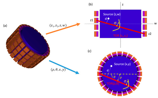 SRMs can be obtained from Monte Carlo simulations [9,20,31] approximated by analytical expressions [35] (Reader 2003), or even measured experimentally [36]. In this work, we used analytic SRMs. To model the problem more realistically for each LOR, we defined a tube of response (TORs) [37], where its width reflects the physical effects. In this work, TORs were assumed to have a Gaussian cross section [18,38,39], whose width () was obtained empirically for a given scanner, being the same for all LORs of the same scanner.