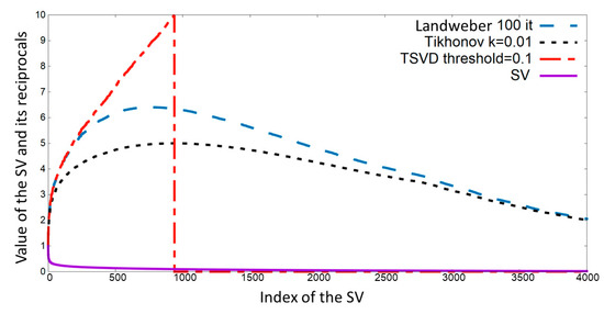 As can be noted, when singular values are very small or null, their reciprocals are not well defined. Small singular values correspond to high frequency elements, which contain the finer details of the image (interesting to keep) as well as most of the noise of the data [15,16,49] (which amplifies the noise in the reconstructed image). To deal with this problem, we used regularization methods [50]. A common regularization approach is truncated singular value decomposition (TSVD), which is obtained by setting to the reciprocal singular values larger than a chosen threshold [51].