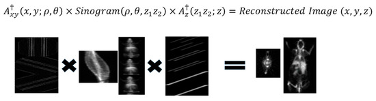 As it has been shown in previous works [3], the pseudoinverse of the SRM can be used for list-mode data reconstruction. In a 3D problem, each column of the PINV of the SRM, , contains the region of the image that would produce a coincidence in the given LOR . Taking this into account, the image can be refreshed after every event. A similar approach is also feasible in the proposed scheme. Each coincidence with coordinates can be separated into transaxial and axial coordinates. Using , for every coincidence with axial coordinates, each z slice of the image is weighted by the corresponding element of the pseudoinverse of the axial SRM . Then, for each axial slice, coordinates of the image are updated event by event using each row of the transaxial SRM pseudoinverse . Although this is fast and feasible for a 2D case as presented by Selivanov and Lecompte [3], it takes longer than reconstructing with the whole sinogram, except for when the number of coincidences is very small. In our case, reading the list-mode coincidences and histograming them in a sonogram is faster than event by event reconstruction, even for frames as small as 0.1 s for the preclinical SuperArgus PET-CT scanner introduced in Section 2.2.1.