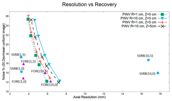 Noise vs. resolution recovery for different rebinning methods (SSRB, FORE, and PINVz). Point sources were simulated in a scanner with a geometry similar to Biograph TPTV with MRD 38 and SPAN 11. Numbers in brackets at the FORE and SSRB points indicate the distance (R,Z) to the center of the scanner in cm, for example, (10,0) represents a source at a radial distance of 10 cm from the center of the scanner at the axis. Several points for PINVz show the axial resolution vs. recovery for a different Landweber iterations, from right to left 5, 8, 10, 15, and 20 iterations. Outside the axis of the scanner, SSRB was not accurate, while FORE provided the best results overall, although with some sensitivity to distance to the scanner axis. PINVz keeps a more uniform resolution across the whole FOV.