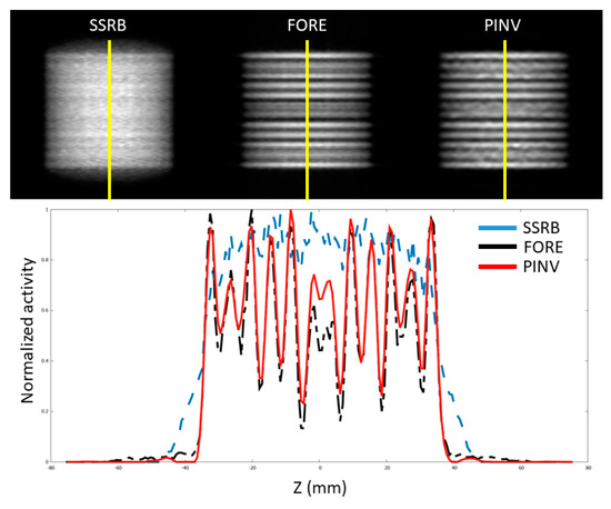 Axial profile of a simulated thin-slice (XX mm slices thickness) Defrise phantom for the SuperArgus scanner reconstructed from the three rebinning methods (top) and a profile along the axis of the scanner (bottom), that is, along the yellow line in the top panel. PINVz rebinning employed 20 iterations.