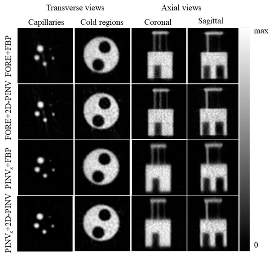 In Table 1, we compared the recovery coefficients for the IQ-NEMA phantom at approximately the same level of uniformity for every rebinning + 2D reconstruction combination. The 2D-PINV slice reconstruction systematically outperformed (around 5–10% better for the smallest capillary and up to 15% in the 2 mm capillary). As expected, FORE rebinning provided the best recovery, improving marginally on the pseudoinverse rebinning results.