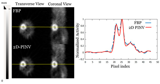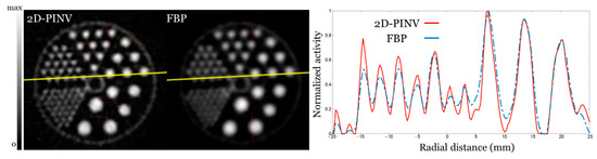 Furthermore, in Figure 8, we present the results for a Derenzo filled with 250 μCi of 18FDG measured with a well-counter with an accuracy of ±5% [11]. It can be seen as an improvement in resolution for 2D-PINV reconstruction when compared to FBP.