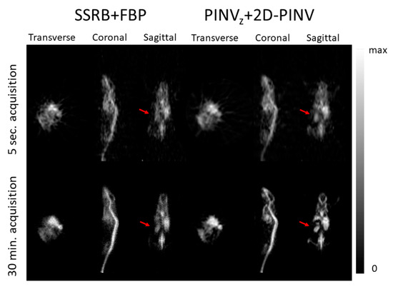 Figure 10 shows the PINVz + 2D-PINV versus SSRB + FBP reconstructions of a 200 g rat injected with 300 μCi of 18FDG where the improvement using PINV was evident. Images from both 30 min (bottom) and 5 s (top) acquisitions are shown, the second demonstrating the capabilities for near real time imaging.