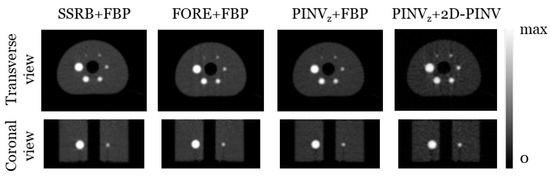 In Figure 6, we can see a coronal view of the reconstruction of a Defrise disk phantom where an improvement in the pseudoinverse rebinning can be appreciated when compared to SSRB. We can see that FORE and PINVz also provided similar detail.