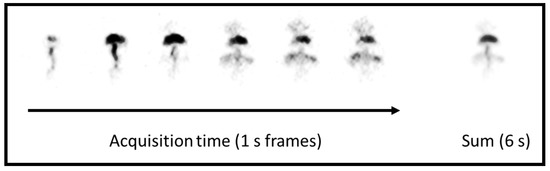 In many cases, real-time images are used to follow radiotracer distribution along the body of a patient for which the sum of the image collapsed in specific directions instead of a 3D presentation of the full image may be enough. This way of presenting real-time PET images is also convenient as short frame images would typically contain a very low number of counts, and 2D projections will be less noisy in this case.