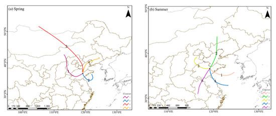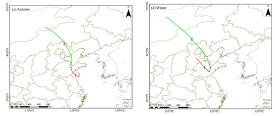 - Seasonal differences in the contributions of potential source regions of PM2.5 in Weifang. In winter, spring, and autumn, airflows are mostly from the northwesterly and northerly directions and significantly influence the PM2.5 concentration in Weifang. However, in summer, airflow trajectories are scattered, and warm and humid airflows from the ocean in the southeastern direction dominate. In winter, spring, and autumn, Weifang is more greatly affected by pollutant transport from nearby inland cities in Shandong and Henan. These transport pathways are short in general, and the wind speeds are low, leading to accumulation of the carried pollutants in Weifang. In contrast, in summer, Weifang is less influenced by pollutants from the surrounding areas, and the potential source regions are mainly located in coastal areas in the east, such as Jiangsu, the Bohai Sea, and the Yellow Sea. It should be noted that the region covering central Inner Mongolia and southern Liaoning is also a potential source area for Weifang.