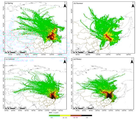 | Proportion (%) | Average (μg/m3) | Proportion of Seasonal Total Polluted Trajectories (%) | Average (μg/m3) | ||