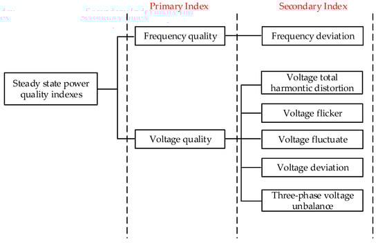 The integration of a photovoltaic power generation system will affect the power quality in frequency, voltage fluctuation, flicker, voltage total harmonic distortion, and so on. Based on the content of China’s national standard for power quality [20,21,22,23,24], we choose six indicators as the steady-state power quality indicators: frequency deviation, voltage deviation, three-phase voltage unbalance, voltage fluctuation, voltage total harmonic distortion, and voltage flicker. The allowable limits of these indicators in China’s national standards are shown in Table 1 [25].