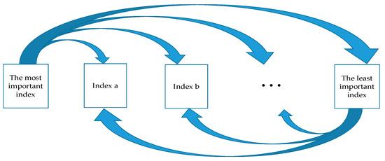 The BW method is a multi-indicator decision-making method [30,31]. Compared with the traditional Analytic Hierarchy Process (AHP) method, it determines weights based on the comparison of the best and the worst standard/alternative with other standards/alternatives, as shown in Figure 2 and Figure 3.