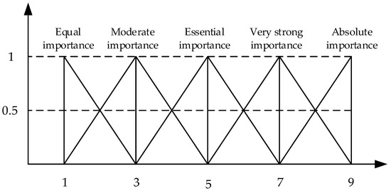 The acquisition of the BO and OW vectors requires consultation with experts to judge the importance of each index. Experts can make a judgment on the importance between the th and th indices by a triangular fuzzy number with the membership function shown in Figure 4 [28]. The boundary value of the triangular fuzzy number could be a non-integer, which can reflect the experts’ understanding of the importance of each index more accurately.