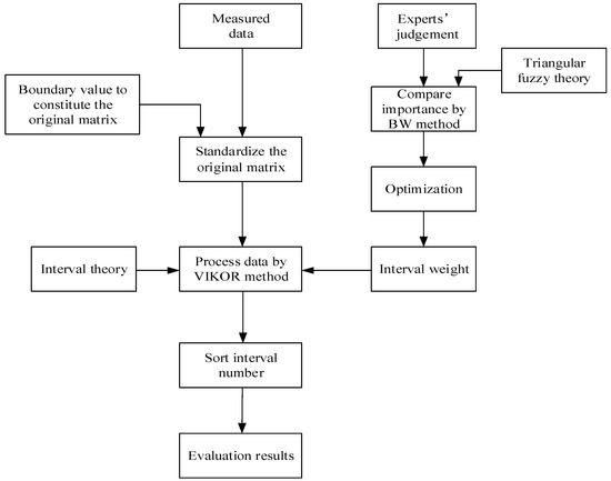 - We combine the triangular fuzzy BW method and the interval VIKOR method to process the experimental monitoring values of power quality indicators. The interval VIKOR method provides an effective approach for handling the data uncertainty present in the interval weights. As the comprehensive evaluation values of power quality are interval numbers, we rank them by a simple yet practical ranking method.
