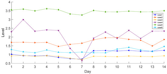 The level here may not be an integer, and the results of sensitivity analysis are presented in Figure 7. We can see that the evaluation results vary with the change of the weights of the six indicators. Therefore, the accurate determination of the weights of the indicators is critical for determining the synthetic evaluation result accurately.