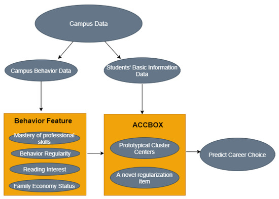 The framework of our model is shown in Figure 1. First, four types of behavioral features are generated based on campus behavioral data: mastery of professional skills, behavior regularity, reading interest, and family economic status. Next, the Approach Cluster Centers Based on XGBOOST (ACCBOX) model can be obtained by our prototypical cluster center generation method and a novel regularization item. Finally, the resulting predicted career choice is presented. We use actual career choice data to evaluate our model.