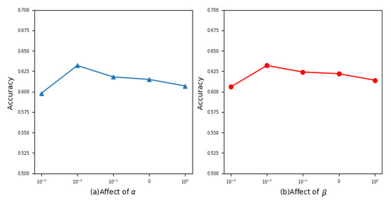 As Figure 3 shows, as α increases in the ACCBOX model, the model attains the highest accuracy if α is 10 2 ; subsequently, the accuracy decreases gradually. As β increases, the accuracy of the model increases gradually. If it is 10 2 , the accuracy reaches the highest level, and subsequently decreases gradually.