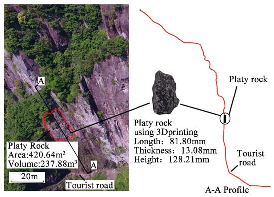 The purpose of this experiment is to study the movement law of the platy rock in the complex steep rock slope through the physical model experiment of the potential platy falling rock in the Xiangbipu rock slope in Shenxianju scenic spot in Zhejiang Province and provide a reference for the design and construction of engineered protection. It shows the shape of the slope and potentially platy rock of the Xiangbipu in Shenxianju scenic spot in Figure 1. Through field investigations, UAV aerial photography and 3D laser scanning, the potential falling rock was identified. The size of the potential falling rock was 12.14 m (length), 1.96 m (width) and 19.02 m (height) and the main lithology of the slope body is tuff.