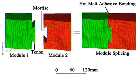 According to the geometric similarity constant , the slope model is scaled to a 3D model of 1 m × 1.5 m (width and height). The 3D printer (Einstart-p, SHINNING 3d technology co., LTD Hangzhou, China) was used to cut the model into mortise and tenon blocks suitable for printing size (as shown in Figure 3) with printing, splicing, and hot melt adhesive for forming, to prevent the free movement of each module in the direction of x, y, or z. After printing and splicing, the final slope model is shown in Figure 2.