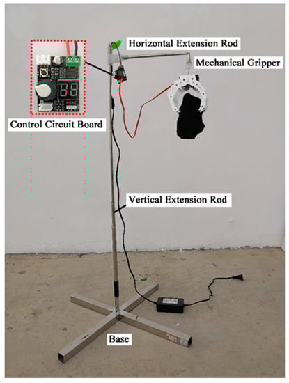 The block release device is composed of five parts (as shown in Figure 4), including the base, vertical extension rod, horizontal extension rod, mechanical gripper, and control circuit board. According to the size of the slope model and the position of the rock fall block, the release device can control the position of the mechanical gripper by adjusting the positions of the vertical and horizontal expansion rods. By controlling the circuit board, the grasping and releasing action of the mechanical gripper can be operated. Therefore, the initial position of the rock fall block stone can be accurately controlled and the interference of human factors can be effectively avoided.