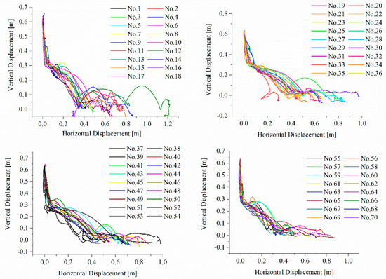 According to the experimental procedure described in Section 2.2, 70 repeated experiments were conducted on the rock fall of the platy rock of the xiangbipu slope in the Shenxianju scenic spot. The experiment results are shown in Figure 6.