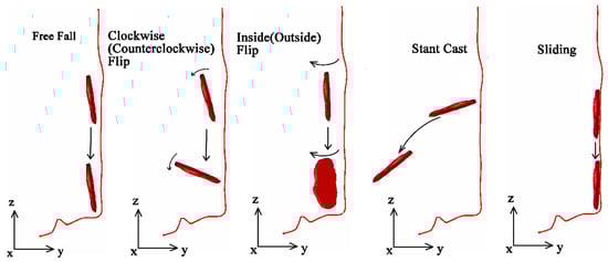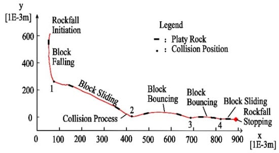 The experimental results show that the trajectory of platy rock rockfall is different from that of other shapes [44]. Free fall, block sliding and block bouncing are the main movement types of platy rock, while block rolling is generally rare. These results can be explained by the complex and irregular shape of the platy rock.