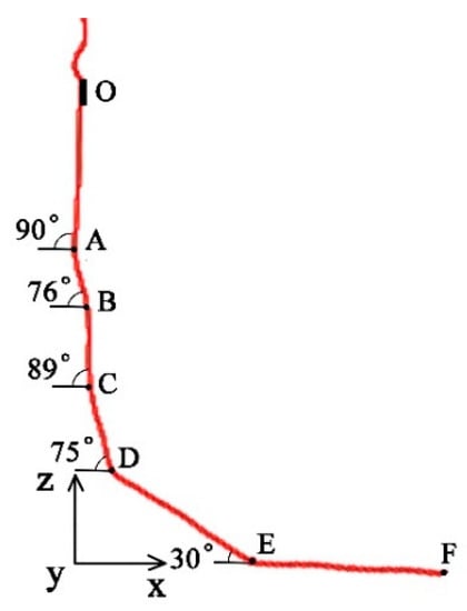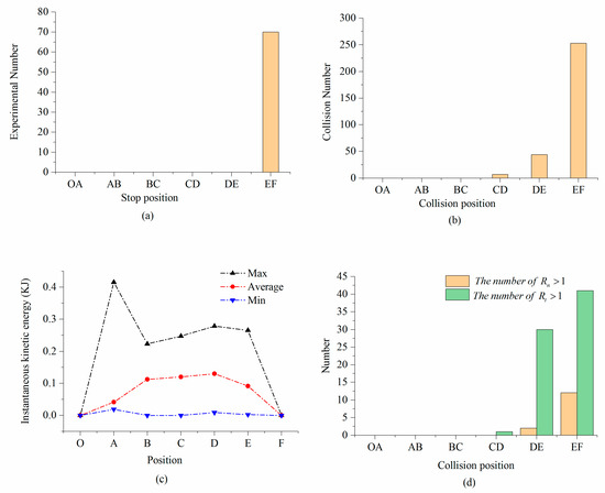 In the 70 repeated experiments, 303 collisions have occurred between the platy rock and the slope. Figure 9b shows that the collision position of the platy rock rockfall was related to the slope. The collision and bouncing have occurred in the areas of CD, DE and EF with gentle slopes. The sliding has occurred in the areas of OA, AB and BC with steep slopes.
