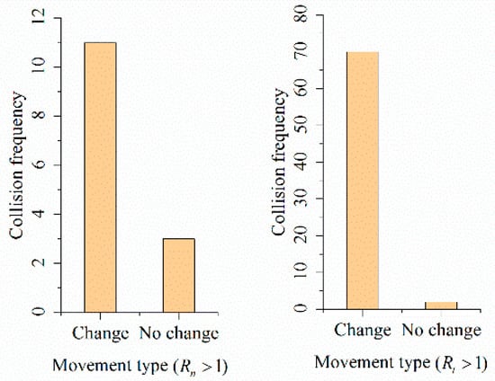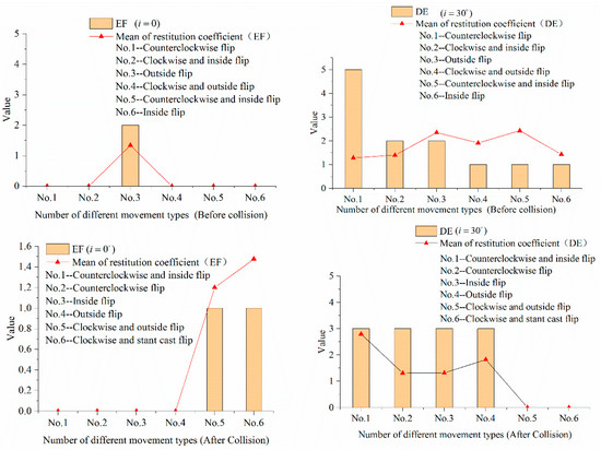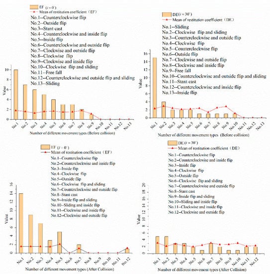 Figure 12 shows that under the condition of same slope, the movement type of platy rock before and after the collision is also an important reason for the occurrence of . In the 72 times of collisions with , there were 41 times of collisions in the EF area () and 31 times of collisions in the DE area (). In the EF area, there were thirteen types of motion before the collision and nine types of them include flip motion. The proportion was 69.2%. The average value was different in various movement types. However, there were 12 types of motion after the collision and all of them include flip motion. The average value was also different in various movement types. In the DE area, there were 13 types of motion before the collision and 10 types of them include flip motion. The proportion was 76.9%. There were 12 types of motion after the collision and 11 types of them include flip motion. The proportion was 91.7%. The average value was also different in various movement types before or after the collision.