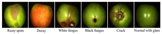 The jujubes used in this study were selected from the jujubes, with clear typical defect(s), screened out during postharvest process in jujube orchard located in Pingtung, Taiwan. The defects of jujube were identified by visual inspection with the assistance from jujube farmers. The samples with normal surfaces and five types of common skin defects (i.e., rusty spots, decay, white fungus, black fungus, and cracks) of Kaohsiung No.11 jujube were collected and stored in inspection laboratory at 25 °C. The hyperspectral images of specimens were acquired within two days after samples obtained. Typical images for each skin condition are shown in Figure 1.