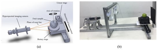 As shown in Figure 2, the direction of scan line of camera and rotation axis of stage was perpendicular to direction of linear stage movement. The linear scan was performed by driving the linear stage without actuating the rotation stage while scanning. On the other hand, when performing a rotation scan, the rotation stage was actuated while the linear stage was held still. Before the rotation scan started, the axis of rotation stage was moved into the plane of line scan by adjusting the position of the linear stage so that the panoramic image of the jujube would be like the cylindrical projection image of a globe-like object. The setup of camera parameters, step motor velocity and operation of system are coordinated through a computer program that was developed in Labview (National Instruments, Austin, TX, USA) and the spectral images were collected in a darkroom. The spatial-spectral data of each scan line was saved as an image file in tagged image file format (TIFF). All TIFF images belonged to the same scan pass were combined to form a three-dimensional data cube when performing data pre-processing.