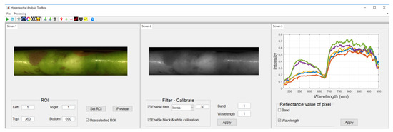 A program with graphic user interface (GUI) developed in Matlab (The MathWorks, Inc.) environment was used to process spectral images (Figure 3). For spectral data of a scan pass, the TIFF images corresponding to each scan line were combined as a three-dimensional data cube (x, y, λ) where x, y, and λ represent spatial and spectral components respectively. Due to the low light output of lamps in the VIS < 468 nm and low quantum efficiency of the CMOS in the NIR > 950 nm, only hyperspectral image data in the wavelength range between 468 nm and 950 nm were used for analysis in this work. A region of interest (ROI) was applied to the data cube to select the relevant subset of data for further process. The locally estimated scatterplot smoothing (LOESS) filter was applied to selected data in the spectral direction, and then the relative reflectance was calculated using white and dark references.