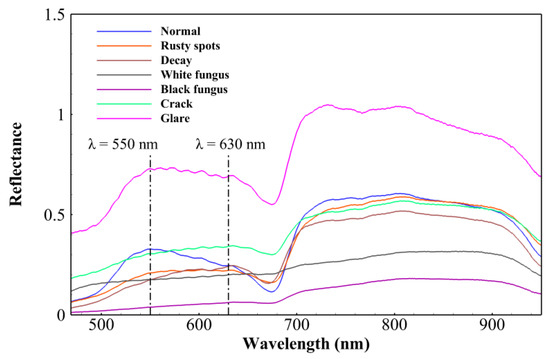 The averaged reflection spectra of common skin defects and glare of the jujube in the wavelength range of 468–950 nm.