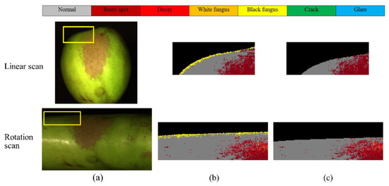 Figure 7 shows the prediction results of four example jujubes using the proposed classification models. These examples included all surface features studied in this work. For each sample, RGB image was shown in the first column, and the classification results of SVM and ANN models were shown in the second and third columns respectively. By using linear scan method, only the image of surface facing camera could be obtained. The surface area, defined by the new mask, suitable for pixel based defect detection was about 43% of the whole jujube surface. By using the rotation scan method, about 91% of pixels of the whole jujube surface area could be used for defect classification.