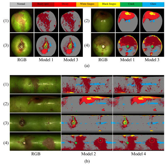 It can be seen from Figure 7 that most of the fruit pixels can be properly classified. However, in Figure 7a, it can be noted that the pixels near the right boundary of the fourth specimen were misclassified as black fungus due to low intensity. Similarly, in the classification results of the third sample shown in Figure 7b, rusty spots near the top of the image misclassified as black fungus could be due to the same reason. It can be noticed that a small region of rusty spots, shown in the circles of Figure 7b, was incorrectly predicted as crack of the fourth jujube sample. By inspecting the color image of this specimen, it can be seen that the rusty area misclassified as crack was brighter than the typical rusty area. The brighter rusty surface could be due to the glare on this rusty area and could be the reason that results in the misclassification. One thing should be pointed out is that jujube surface could have many small rusty spots thus many clusters of pixels classified as rusty spots could be small (only several pixels). Therefore, if image post processing were used to improve accuracy, a particle filter should be used with care to avoid removing small rusty spots by mistake. The Kaohsiung No.11 jujube has smooth calyx; however, the concave feature of stem-end of the Kaohsiung No.11 jujube is similar to that of apple. The color of calyx is similar to that of rusty spot. The color of normal stem-end is the same as that of normal jujube surface; however, the surface of stem-end, compared with other normal surface, could present a relative low intensity due to the curvature of stem-end. Furthermore, during harvesting, the stem of the jujube could remain on the tree and the skin and flesh surrounding the stem could be pulled out of the jujube (Figure 7b (4)). Therefore, it would be necessary to consider methods to recognize stem-end and calyx and to differentiate the normal stem-end and calyx from the real defects in the future work.
