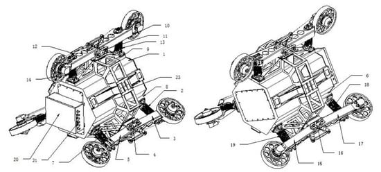 Previous design of oil pipeline inspection robot: (1) power box; (2) spring mechanism No. 1; (3) motion component No. 1; (4) connection component No. 1; (5) motion component No. 2; (6) fixture No. 3; (7) spring mechanism No. 2; (8) fixture No. 1; (9) fixture No. 2; (10) motion component No. 3; (11) connection component No. 2; (12) motion component No. 4; (13) spring mechanism No. 3; (14) spring mechanism No. 4; (15) motion component No. 5; (16) connection component No. 3; (17) motion component No. 6; (18) spring mechanism No. 6; (19) spring mechanism No. 5; (20) control box; (21) waterproof charging connector; (22) battery; (23) chassis.