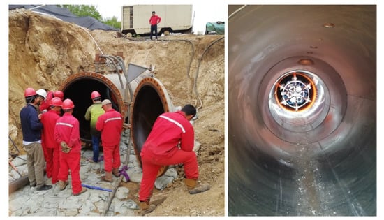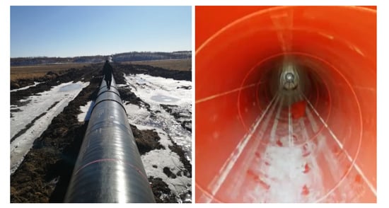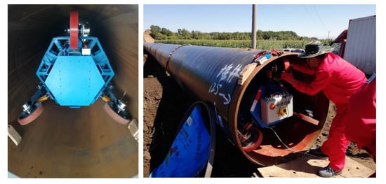 After the aforementioned performance testing, stability testing was conducted in the severe environment at the Heihe Pipeline Construction Site (Long Town, Heihe City, Heilongjiang Province, China). In an outdoor environment where the temperature is between C to C, the testing lasted a week. The testing scene is shown in Figure 12, where the thicknesses of the pipelines (#LY3407358) are mm. In this testing, the inspection robot is required to operate in a long pipeline with multiple challenges: horizontal sections, horizontal curved sections, curved pipe climbing sections, and sections with ice. In addition, the inspection robot must have a continuously clear recording inside the pipeline.