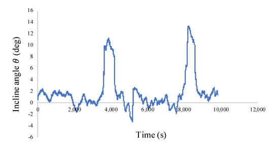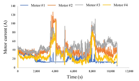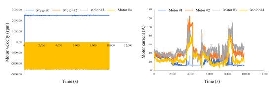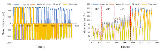 Figure 9 shows the velocities and currents of four motors during this testing. For better visualization, this paper only shows four motors. In Figure 9, there is almost no change when the incline angle increased from to . Besides, the overall trend of currents is shown as a piecewise function curve with distinct segments.