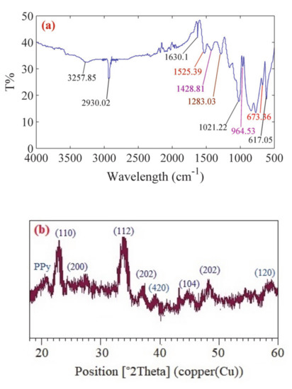 Figure 2 shows the FT-IR spectrum, XRD analysis result, and FE-SEM image. Figure 2a shows the FT-IR spectrum; the main peaks of the FT-IR spectrum appeared at 3257.85, 2930.02, 1630.1, 1525.39, 1428.81, 1283.03, 1021.22, 964.53, 673.36, and 617.05 cm-1. The peaks at 3257.85, 1525.39, and 1428.81 cm-1 related to the stretching vibrations of N–H, C–N, and C–C in the pyrrole ring, respectively [27,28]. The peak centered at 2930.02 cm-1 corresponded to the asymmetric vibration of CH2, and the peaks that appeared at 1283.03, 1021.22, and 964.53 cm-1 were assigned to the C–H deformation, C–O–C, and the C–N stretching vibration of PPy, respectively. Moreover, the peaks located at 3257.85 and 2930.02 cm-1 corresponded to N–H, while the vibration of CH2 of the chitosan chain overlapped on the vibration of N=H and CH2 in polypyrrole [28]. The peaks at 1630.1, 673.36, and 617.05 cm-1 presented a vibration of C=O in the amid band, N–H out of the plane, and O–H out of the plane in chitosan [29].
