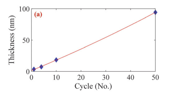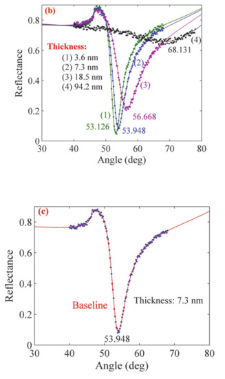 The gold/PPy–Chi–BaFe2O4 system layer was prepared in different thickness. The thickness of the gold layer was 48.3 nm, and the thickness of the PPy–Chi–BaFe2O4 composite layers was tested using a profilometer (AMBIOS, XP-200) in the range of 3 ± 1 nm to 94 ± 1 nm, and Figure 3a shows that the thickness of the layers increased as the cycle increases. The system layer was coated on the microscope glass slide, and it was attached to the prism using index matching gel. The SPR signal was separately registered for each thickness in the presence of DDW (n = 1.3323). Figure 3b,c shows the SPR results to test the refractive index of the layers and baseline. The refractive index of the layer was achieved by analysis of the SPR signal using Fresnel’s theory for the multilayer system when the refractive index of the gold layer was 0.237 + 3.335i.