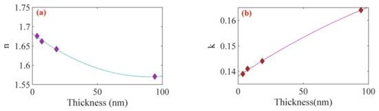 The variation of real (n) and imaginary (k) parts of the refractive index were demonstrated in Figure 4a,b, respectively. Consequently, the real (n) part of the refractive index decreased, and the imaginary (k) part of the PPy–Chi–BaFe2O4 increased when the thickness of the layer increased. The pertinent parameters were listed in Table 1.