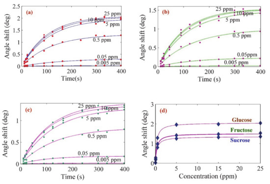 The variation of the resonance angle shift with time-related to (a) glucose, (b) fructose, and (c) sucrose. (d) Variation of the resonance angle shift with the concentration of the sugar.