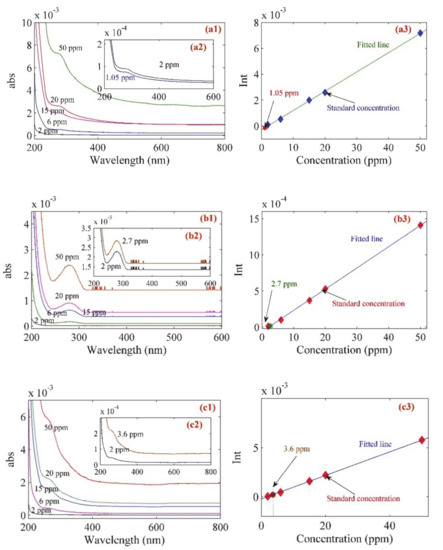 where and were the initial and final concentration of the sugar. Figure 6a1,a2,b1,b2,c1,c2 shows the UV-visible spectra of the glucose, fructose, and sucrose in the concentrations of 2 ppm (0.2 mg/dL), 6 ppm (0.6 mg/dL), 15 ppm (1.5 mg/dL), 20 ppm (2 mg/dL), and 50 ppm (5 mg/dL). The main peak occurred at about 280 nm for them. The intensity peaks were driven for each concentration of the glucose, fructose, and sucrose. Figure 6a3, b3, c3 shows the variation of peak intensity with each concentration of the sugar as a calibration curve. Figure 6a2,b2,c2 show the UV-vis spectra of the sugar solutions after they contacted with the sensing layer and the concentration of glucose, fructose, and sucrose after contact with the PPy–Chi–BaFe2O4 sensing layer was achieved from the calibration curve. As a result, the concentration of glucose was lower than that of the other sugars, and it means that the affinity of the PPy–Chi–BaFe2O4 nanocomposite layer to the adsorption of the glucose is much higher than that of the other sugars. The concentration value of the sugar and the degree of adsorption are listed in Table 2.