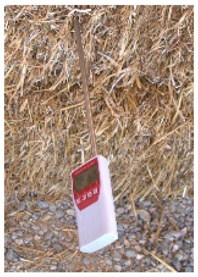 A straw hygrometer used to control humidity during construction. The moisture content of each straw bale is recorded.