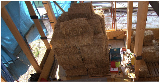 However, it is also possible to deposit bales outside, arranging them in a pyramid shape, and to cover them with a waterproof cover. Pallets can then be used as a base to lift them and avoid contact with damp earth. Particular attention should be paid during the construction phases; if the construction site protection systems are not sufficient to shield the straw from rain, further quality controls should be conducted to verify the degree of dryness before proceeding with subsequent coating layers (Figure 4).